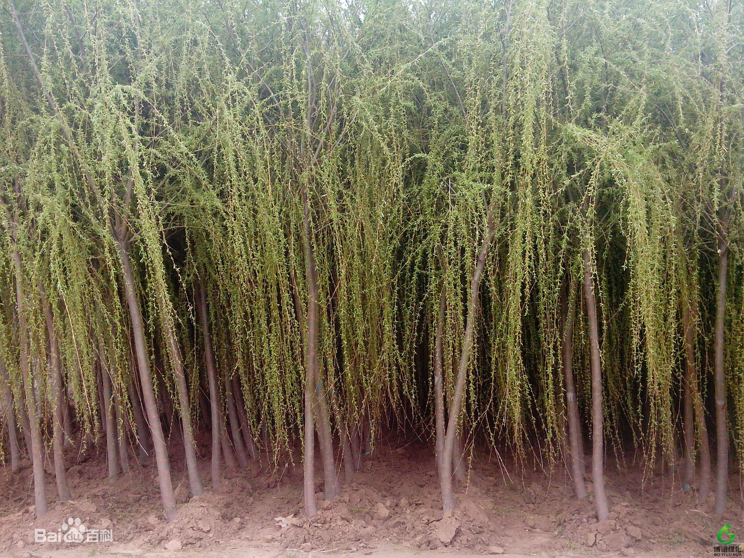 垂柳是高大乔木,高度可达18m;树冠倒广卵形。小枝细长,枝条非常柔软,细枝下垂,长度有1.5~3米长。叶狭披针形至线状披针形,长8~16cm,先端渐长尖 ,缘有细锯齿,表面绿色,背面蓝灰绿色;叶柄长约1cm;托叶扩镰形,早落。雄花具2雄蕊,2腺体;雌花子房仅腹面具1腺体。花期3~4月;果熟期4~5月。